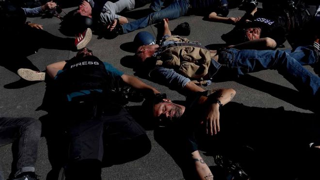 El Periódico: Reporteros escenifican ante el Congreso la muerte de compañeros en Gaza en el aniversario de los atentados